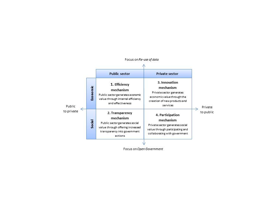 Recent trends towards openness and technical connectivity have offered the ability to drive massive social and economic change; however they demand a redefinition of relationships. We have observed a move from a polarized world where companies operate in economic markets while governments drive social progress, to an interconnected, networked world of shared resources and co-creation. One of the trends driving this change is open government data. This paper presents a framework of four value generating mechanisms from use of OGD. The framework makes it easier to compare and communicate different pathways to value generation, while highlighting the current tensions between the private/public and economic/social domains. Our proposition is that these tensions bring about possibilites for synergies and value enhancement.
